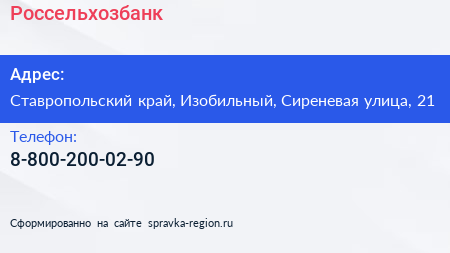 Россельхозбанк по адресу Ставропольский край, Изобильный, Сиреневая улица, 21 в дальнейшем Организация, размещена в следующих категориях: