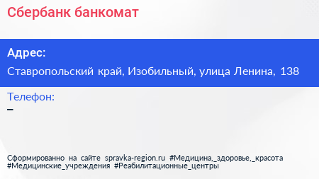 Сбербанк, банкомат по адресу Ставропольский край, Изобильный, улица Ленина, 138 в дальнейшем Организация, размещена в следующих категориях: