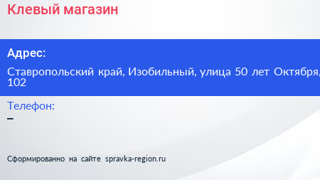 Клевый магазин по адресу Ставропольский край, Изобильный, улица 50 лет Октября, 102 в дальнейшем Организация, размещена в следующих категориях: