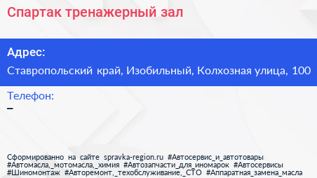 Спартак, тренажерный зал по адресу Ставропольский край, Изобильный, Колхозная улица, 100 в дальнейшем Организация, размещена в следующих категориях: