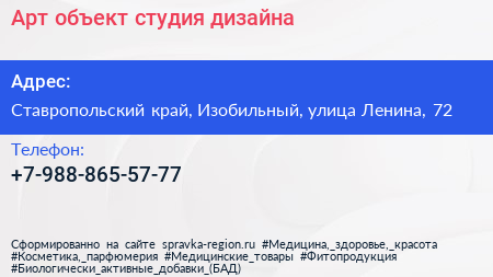 Арт объект, студия дизайна по адресу Ставропольский край, Изобильный, улица Ленина, 72 в дальнейшем Организация, размещена в следующих категориях: