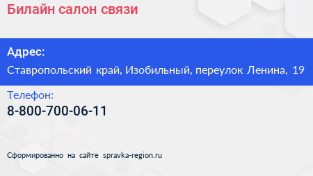 Билайн, салон связи по адресу Ставропольский край, Изобильный, переулок Ленина, 19 в дальнейшем Организация, размещена в следующих категориях: