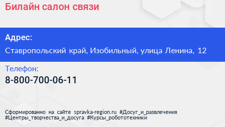 Билайн, салон связи по адресу Ставропольский край, Изобильный, улица Ленина, 12 в дальнейшем Организация, размещена в следующих категориях: