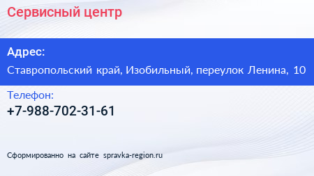 Сервисный центр по адресу Ставропольский край, Изобильный, переулок Ленина, 10 в дальнейшем Организация, размещена в следующих категориях: