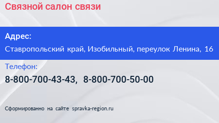 Связной, салон связи по адресу Ставропольский край, Изобильный, переулок Ленина, 16 в дальнейшем Организация, размещена в следующих категориях: