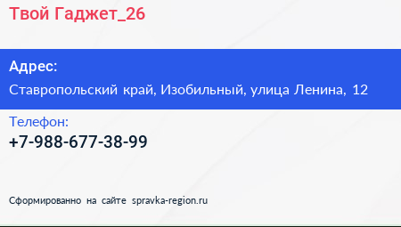 Твой Гаджет_26 по адресу Ставропольский край, Изобильный, улица Ленина, 12 в дальнейшем Организация, размещена в следующих категориях: