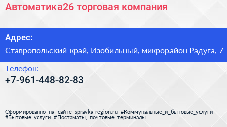 Автоматика26, торговая компания по адресу Ставропольский край, Изобильный, микрорайон Радуга, 7 в дальнейшем Организация, размещена в следующих категориях:
