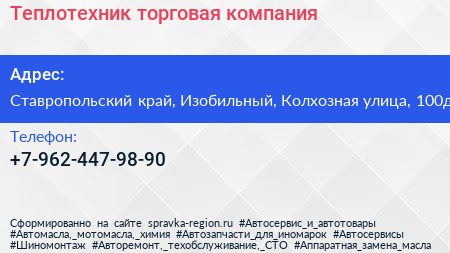 Теплотехник, торговая компания по адресу Ставропольский край, Изобильный, Колхозная улица, 100д в дальнейшем Организация, размещена в следующих категориях: