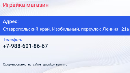 Играйка, магазин по адресу Ставропольский край, Изобильный, переулок Ленина, 21а в дальнейшем Организация, размещена в следующих категориях: