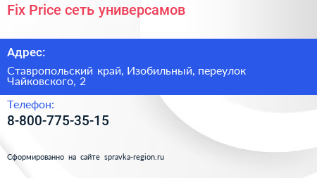 Fix Price, сеть универсамов по адресу Ставропольский край, Изобильный, переулок Чайковского, 2 в дальнейшем Организация, размещена в следующих категориях: