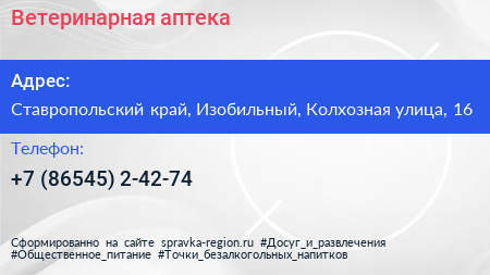 Ветеринарная аптека по адресу Ставропольский край, Изобильный, Колхозная улица, 16 в дальнейшем Организация, размещена в следующих категориях: