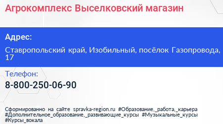 Агрокомплекс Выселковский, магазин по адресу Ставропольский край, Изобильный, посёлок Газопровода, 17 в дальнейшем Организация, размещена в следующих категориях: