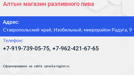 Алтын, магазин разливного пива по адресу Ставропольский край, Изобильный, микрорайон Радуга, 9 в дальнейшем Организация, размещена в следующих категориях: