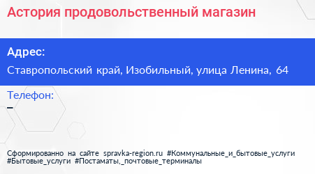 Астория, продовольственный магазин по адресу Ставропольский край, Изобильный, улица Ленина, 64 в дальнейшем Организация, размещена в следующих категориях: