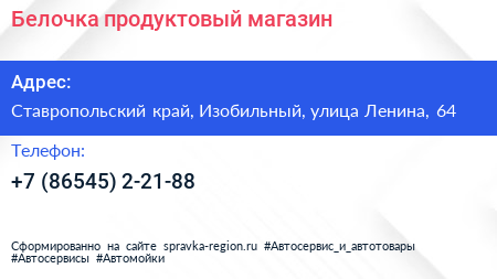Белочка, продуктовый магазин по адресу Ставропольский край, Изобильный, улица Ленина, 64 в дальнейшем Организация, размещена в следующих категориях: