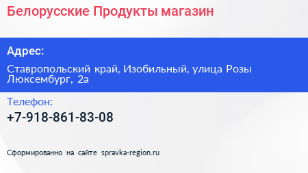 Белорусские Продукты, магазин по адресу Ставропольский край, Изобильный, улица Розы Люксембург, 2а в дальнейшем Организация, размещена в следующих категориях: