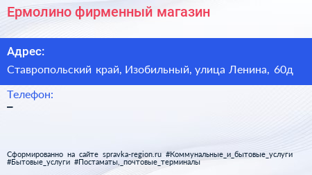 Ермолино, фирменный магазин по адресу Ставропольский край, Изобильный, улица Ленина, 60д в дальнейшем Организация, размещена в следующих категориях: