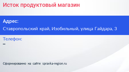 Исток, продуктовый магазин по адресу Ставропольский край, Изобильный, улица Гайдара, 3 в дальнейшем Организация, размещена в следующих категориях: