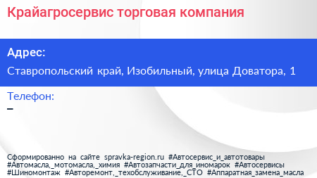 Крайагросервис, торговая компания по адресу Ставропольский край, Изобильный, улица Доватора, 1 в дальнейшем Организация, размещена в следующих категориях: