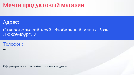 Мечта, продуктовый магазин по адресу Ставропольский край, Изобильный, улица Розы Люксембург, 2 в дальнейшем Организация, размещена в следующих категориях: