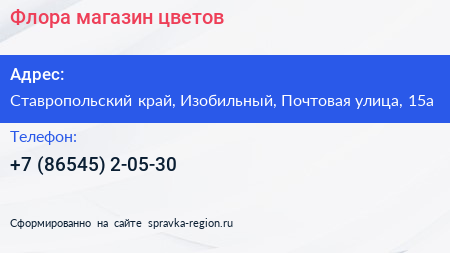 Флора, магазин цветов по адресу Ставропольский край, Изобильный, Почтовая улица, 15а в дальнейшем Организация, размещена в следующих категориях: