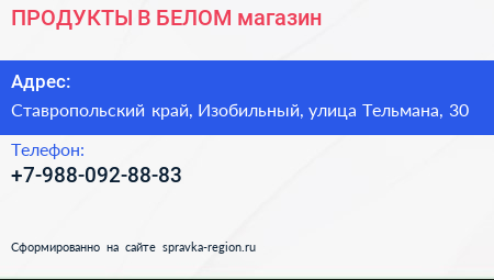 ПРОДУКТЫ В БЕЛОМ, магазин по адресу Ставропольский край, Изобильный, улица Тельмана, 30 в дальнейшем Организация, размещена в следующих категориях: