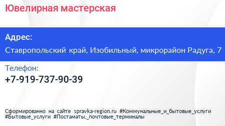 Ювелирная мастерская по адресу Ставропольский край, Изобильный, микрорайон Радуга, 7 в дальнейшем Организация, размещена в следующих категориях: