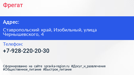 Фрегат по адресу Ставропольский край, Изобильный, улица Чернышевского, 4 в дальнейшем Организация, размещена в следующих категориях: