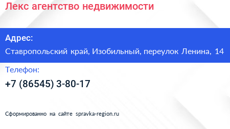 Лекс, агентство недвижимости по адресу Ставропольский край, Изобильный, переулок Ленина, 14 в дальнейшем Организация, размещена в следующих категориях: