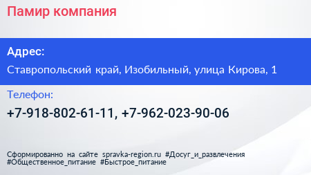 Памир, компания по адресу Ставропольский край, Изобильный, улица Кирова, 1 в дальнейшем Организация, размещена в следующих категориях:
