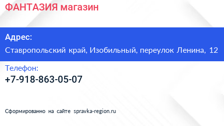 ФАНТАЗИЯ, магазин по адресу Ставропольский край, Изобильный, переулок Ленина, 12 в дальнейшем Организация, размещена в следующих категориях: