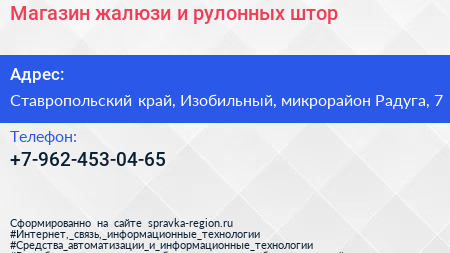 Магазин жалюзи и рулонных штор по адресу Ставропольский край, Изобильный, микрорайон Радуга, 7 в дальнейшем Организация, размещена в следующих категориях: