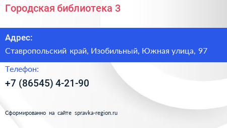 Городская библиотека №3 по адресу Ставропольский край, Изобильный, Южная улица, 97 в дальнейшем Организация, размещена в следующих категориях: