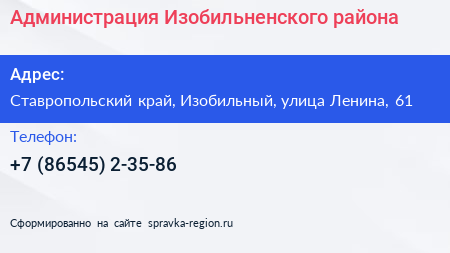 Администрация Изобильненского района по адресу Ставропольский край, Изобильный, улица Ленина, 61 в дальнейшем Организация, размещена в следующих категориях: