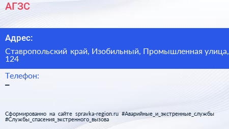 АГЗС по адресу Ставропольский край, Изобильный, Промышленная улица, 124 в дальнейшем Организация, размещена в следующих категориях: