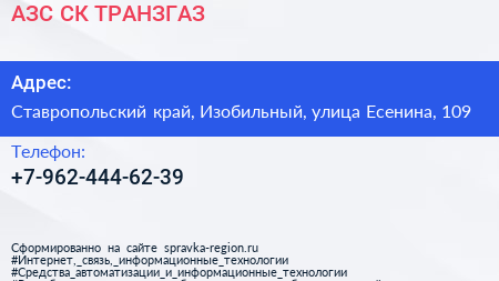 АЗС СК-ТРАНЗГАЗ по адресу Ставропольский край, Изобильный, улица Есенина, 109 в дальнейшем Организация, размещена в следующих категориях: