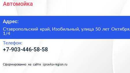 Автомойка по адресу Ставропольский край, Изобильный, улица 50 лет Октября, 1/4 в дальнейшем Организация, размещена в следующих категориях: