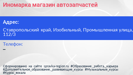 Иномарка, магазин автозапчастей по адресу Ставропольский край, Изобильный, Промышленная улица, 112/3 в дальнейшем Организация, размещена в следующих категориях: