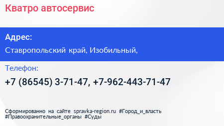 Кватро, автосервис по адресу Ставропольский край, Изобильный, в дальнейшем Организация, размещена в следующих категориях: