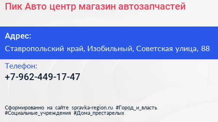 Пик-Авто центр, магазин автозапчастей по адресу Ставропольский край, Изобильный, Советская улица, 88 в дальнейшем Организация, размещена в следующих категориях: