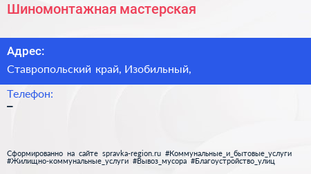 Шиномонтажная мастерская по адресу Ставропольский край, Изобильный, в дальнейшем Организация, размещена в следующих категориях: