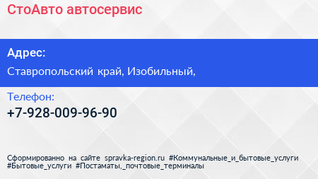 СтоАвто, автосервис по адресу Ставропольский край, Изобильный, в дальнейшем Организация, размещена в следующих категориях: