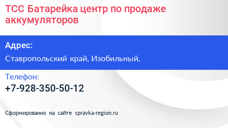 ТСС Батарейка, центр по продаже аккумуляторов по адресу Ставропольский край, Изобильный, в дальнейшем Организация, размещена в следующих категориях:
