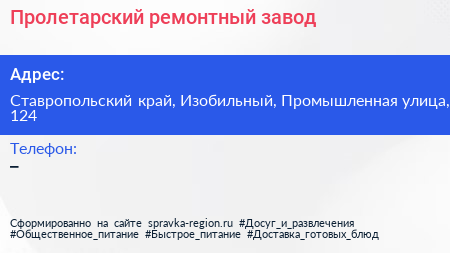 Пролетарский ремонтный завод по адресу Ставропольский край, Изобильный, Промышленная улица, 124 в дальнейшем Организация, размещена в следующих категориях: