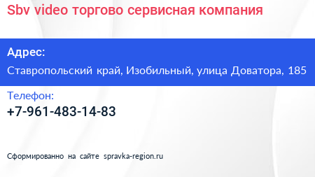 Sbv-video, торгово-сервисная компания по адресу Ставропольский край, Изобильный, улица Доватора, 185 в дальнейшем Организация, размещена в следующих категориях: