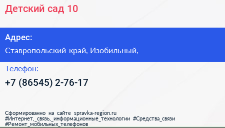 Детский сад №10 по адресу Ставропольский край, Изобильный, в дальнейшем Организация, размещена в следующих категориях: