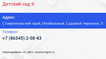 Детский сад №9 по адресу Ставропольский край, Изобильный, Садовый переулок, 3 в дальнейшем Организация, размещена в следующих категориях: