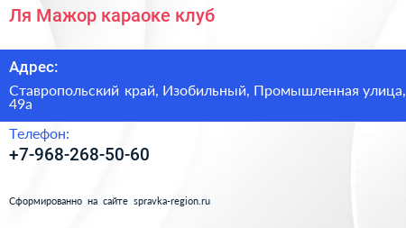 Ля Мажор, караоке-клуб по адресу Ставропольский край, Изобильный, Промышленная улица, 49а в дальнейшем Организация, размещена в следующих категориях:
