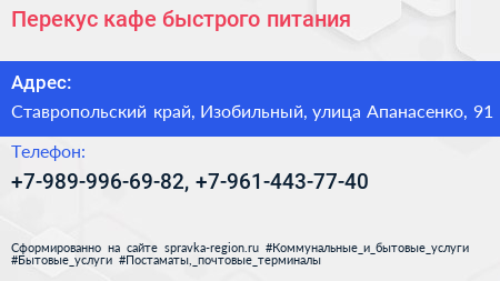 Перекус, кафе быстрого питания по адресу Ставропольский край, Изобильный, улица Апанасенко, 91 в дальнейшем Организация, размещена в следующих категориях: