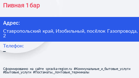 Пивная №1, бар по адресу Ставропольский край, Изобильный, посёлок Газопровода, 2 в дальнейшем Организация, размещена в следующих категориях: